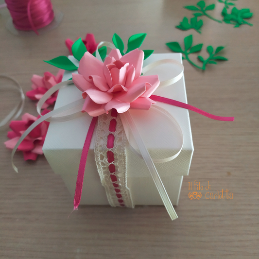 Scatola in cartoncino con rosa realizata a mano, pizzo e nastro in doppio raso