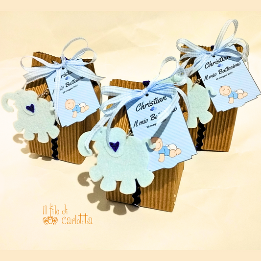 Scatolina del latte in cartoncino ondulato con elefantino azzurro portachiavi in feltro